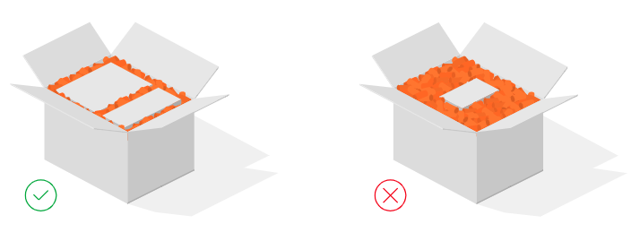 ???? Achten Sie darauf, dass es zwischen den Außenwänden des Versandkartons und der darin befindlichen Ware mindestens 5 cm Abstand gibt. Füllen Sie den Freiraum zur Dämpfung von Stößen mit Füllmaterial aus.